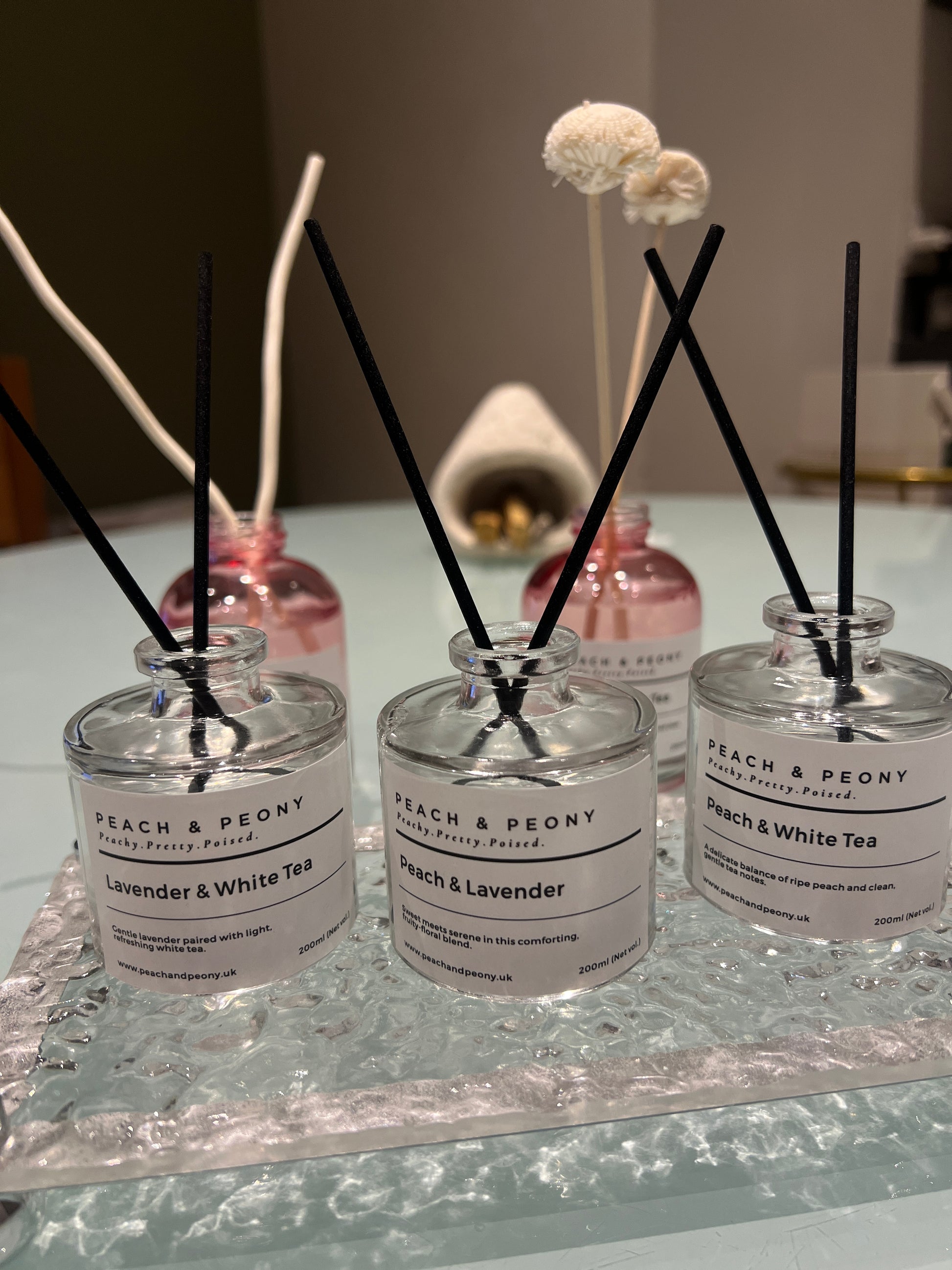 - Scents: Peach & Lavender, Peach & White Tea, Lavender & White Tea
