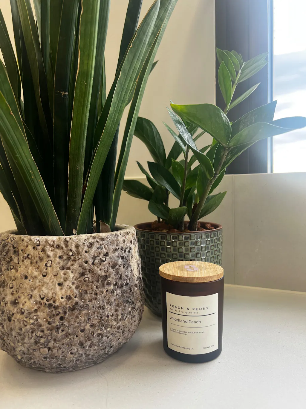 Woodland Peach – A grounding blend where rich black tea and earthy eucalyptus meet soft florals. Peony, peach, and violet add an elegant softness, while deep sandalwood anchors the scent. Poured with natural beeswax, this fragrance evokes the quiet calm of a twilight forest.